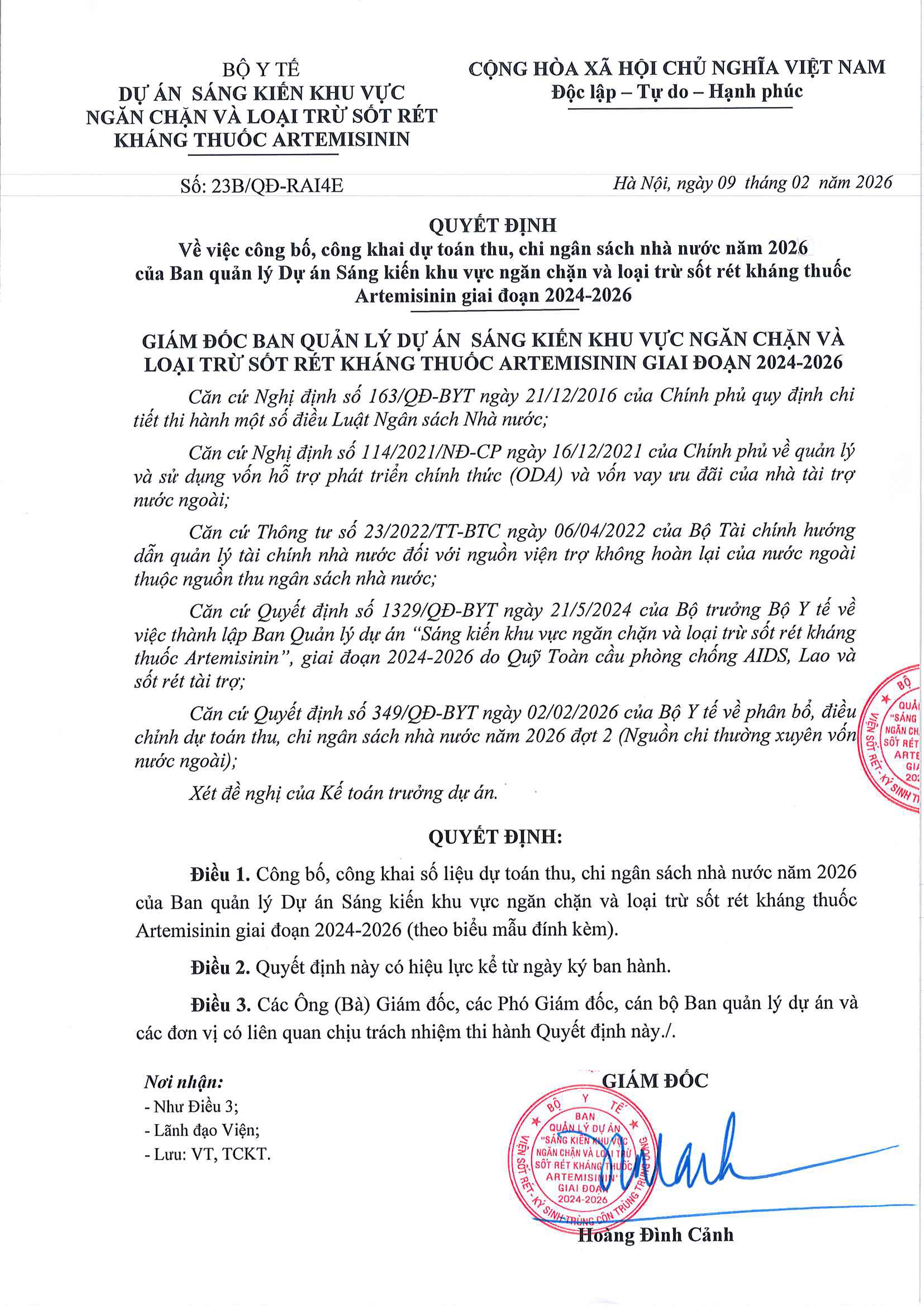 Thông báo quyết định Về việc công bố, công khai dự toán thu, chi ngân sách nhà nước năm 2026 của Ban quản lý Dự án Sáng kiến khu vực ngăn chặn và loại trừ sốt rét kháng thuốc Artemisinin giai đoạn 2024-2026