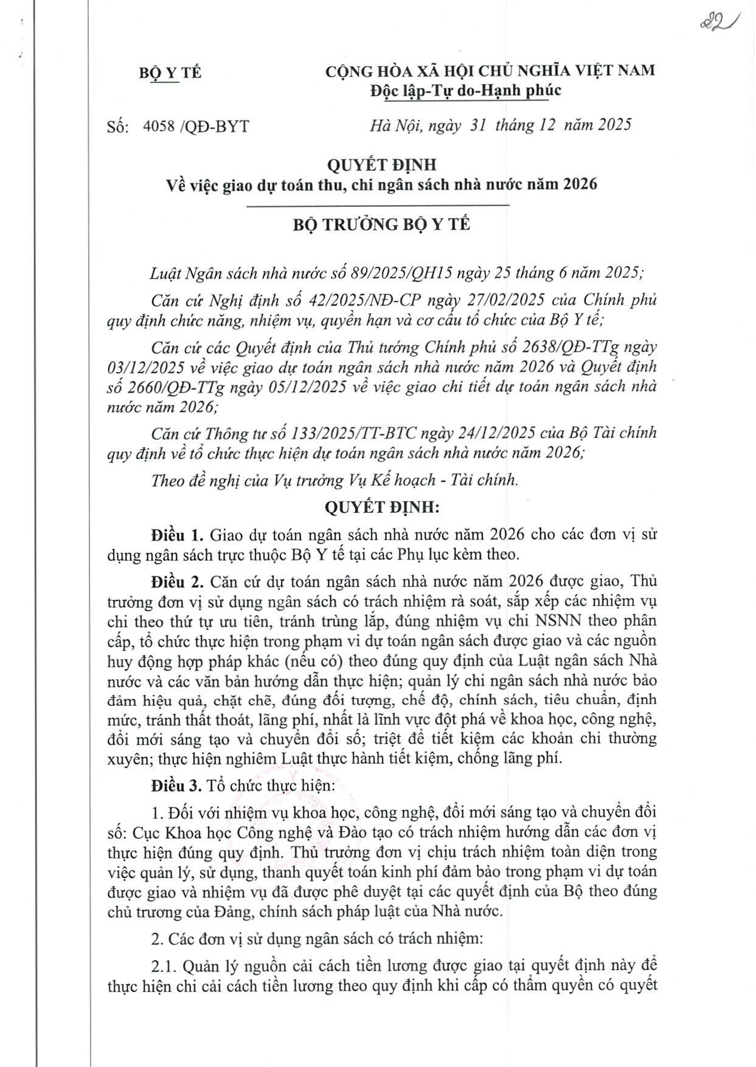 Quyết định số 4058/QĐ-BYT về việc giao dự toán thu, chi ngân sách Nhà nước năm 2026
