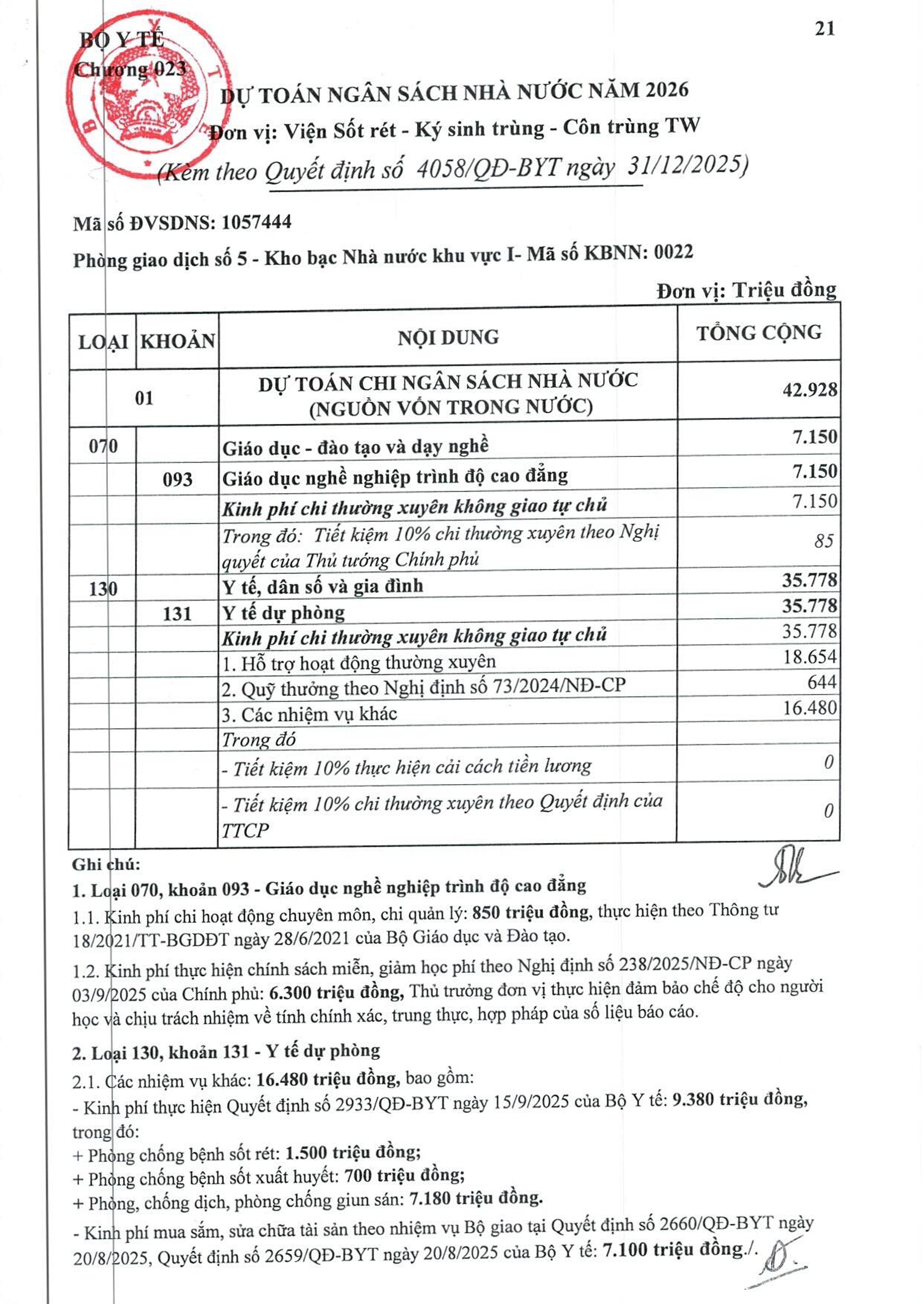 Quyết định về việc công bố, công khai giao dự toán ngân sách năm 2026 của Viện Sốt rét - Ký sinh trùng - Côn trùng Trung ương